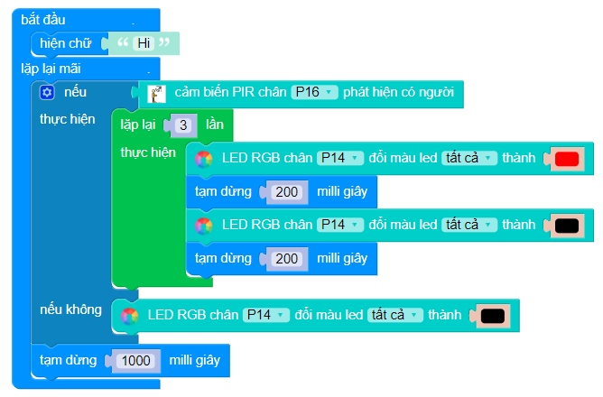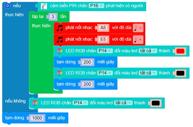 Hãy cùng lập trình tính năng đầu tiên: Nếu như cảm biến chuyển động phát hiện được có người, hệ thống sẽ chớp tắt đèn đỏ 3 lần. Ngược lại, nếu phát hiện không có người thì hệ sẽ tắt đèn (đèn màu đen). Chương trình lúc này sẽ như sau:
