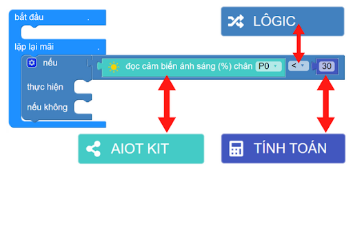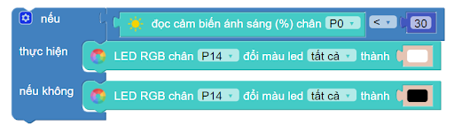 Đầu tiên, chúng ta sẽ đặt điều kiện nếu trời tối (độ sáng < 30) như bên dưới. Các khối lệnh được lấy trong từng danh mục tương ứng:
