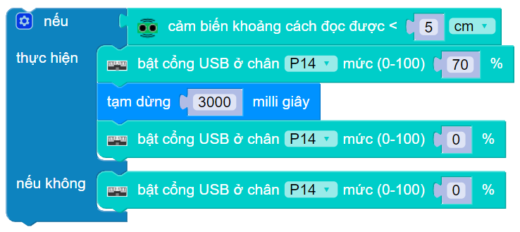 Chúng ta sẽ kết hợp khối lệnh trên với câu lệnh điều kiện để viết chương trình: Nếu khoảng cách bé hơn 5cm, máy bơm sẽ bật 3 giây rồi tắt. Ngược lại, nếu khoảng cách lớn hơn 5cm, máy bơm sẽ không hoạt động.
