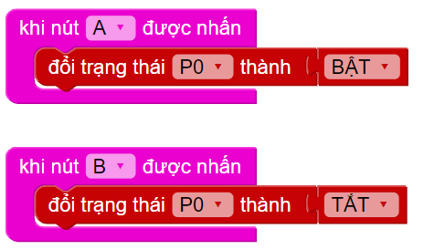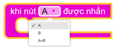 Đây là khối lệnh có thể chọn lựa được, với 3 tùy chọn khác nhau, dành cho nút A, nút B và khi nhấn 2 nút cùng lúc. Với yêu cầu của đề bài, chúng ta chỉ cần 2 khối cho 2 nút A và B mà thôi. Chương trình gợi ý khi nhấn nút sẽ như sau: