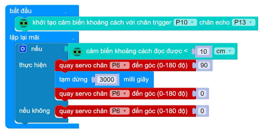 Nếu khoảng cách bé hơn 10cm, hệ thống sẽ thực hiệu quay servo chân P6 đến vị trí 90 độ sau đó chờ 3000ms giây (tương ứng với 3s), sau đó đóng nắp lại.