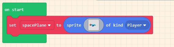 Tìm và lấy khối set mySprite to sprite of kind player đặt vào on start. nhấp vào biến mySprite, chọn Rename variable…, và đổi tên thành spacePlane.