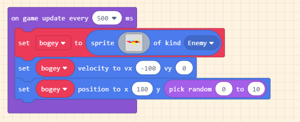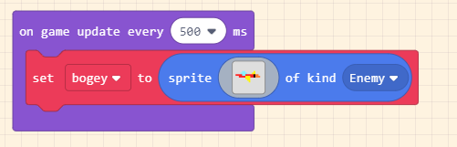 Vào mục Game lấy khối on game update every và đặt nó vào vùng kéo thả. Lấy khối set mySprite to sprite of kind player đặt vào trong on update interval, đổi tên biến thành bogey. Sau đó thay biến kind từ Player thành Enemy. Nhấp vào hình ảnh sprite trống để mở trình chỉnh sửa hình ảnh. Vẽ một hình ảnh của một máy bay địch.