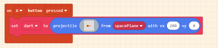 Quay lại Sprites, tìm khối set projectile to projectile from mySprite và đặt nó vào trong on A button pressed. Click vào biến projectile chọn Rename variable…, và đổi tên thành dart. Chuyển biến mySprite thành spacePlane, đặt vx thành 200, đặt vy thành 0.