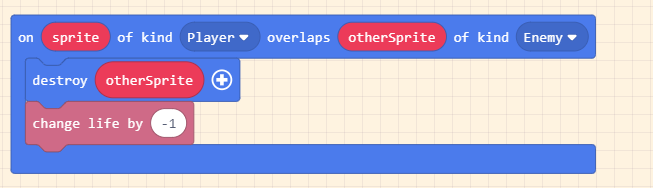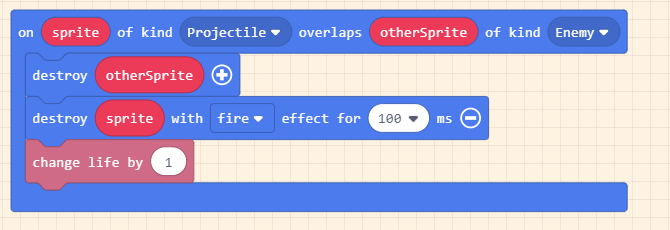 Tạo một bản sao on sprite of kind Player overlaps bằng cách nhấp chuột trái vào nó và chọn Duplicate. Trong khối mới đó, thay đổi Player thành projectile. Và thay đổi giá trị trong change life by bằng 1.