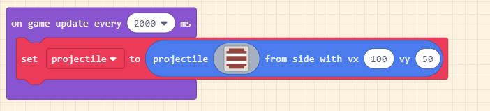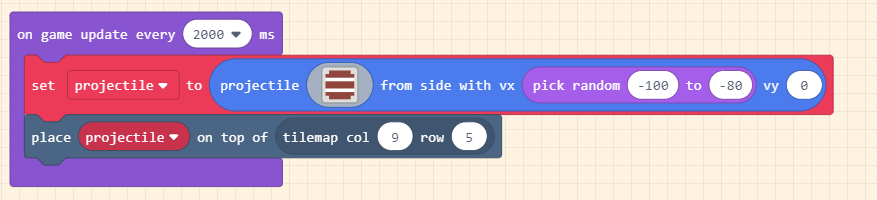 Tìm khối place mySprite on top of tilemap col row và kéo khối on game update interval thả vào sau set projectile to. Đặt giá trị col thành 9 và row thành 5, đó là ô ở bên phải màn hình ngay phía trên tường. Thay mySprite thành projectile.