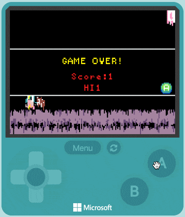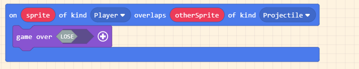 Nếu cái thùng chạm vào người chơi thì trò chơi sẽ kết thúc. Kéo khối on sprite overlaps vào màn hình làm việc thay đổi otherSprite thành Projectile. Đặt khối game over vào trong.