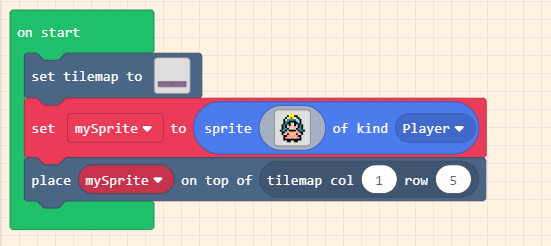 Tìm khối set mySprite to trong Sprites. thả vào khối on start và tạo một nhân vật người chơi.