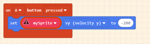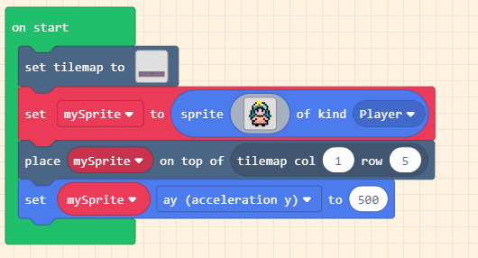 Kéo khối set mySprite x vào on start, nhấp vào menu thả xuống và chọn ay (acceleration y). Đặt giá trị thành 500 sao cho nhân vật bị kéo xuống bởi trọng lực hấp dẫn.