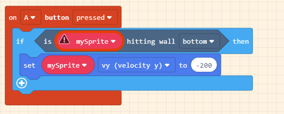 Tạo sự kiện nhân vật bật nhảy khi nhấn nút. Kéo khối if then thả vào khối on A button pressed. Thay true thành khối is mySprite hitting wall và đổi left thành bottom. Cuối cùng đặt khối set mySprite x và chọn vy (velocity y) đặt giá trị biến thành -200.