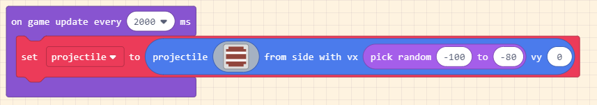 Tạo vật cản di chuyển với tốc độ ngẫu nhiên. Làm cho chúng bắt đầu từ phía bên phải của màn hình và bay về phía người chơi. Di chuyển on game update every lên trình chỉnh sửa và đặt thời gian cách nhau thành 2000 mili giây. Kéo một projectile from side vào nó và vẽ một chiếc thùng làm vật cản.