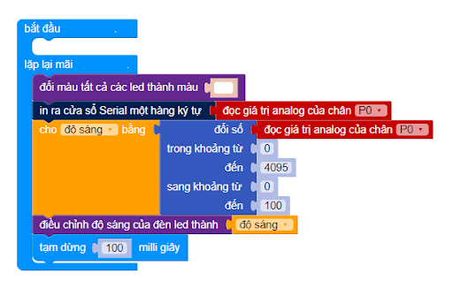 Tạo biến một độ sáng, giá trị của độ sáng sẽ được chuyển từ giá trị analog 0- 4095 thành 0 - 100%. Khi núm xoay của cảm biến được vặn, độ sáng sẽ được thay đổi.