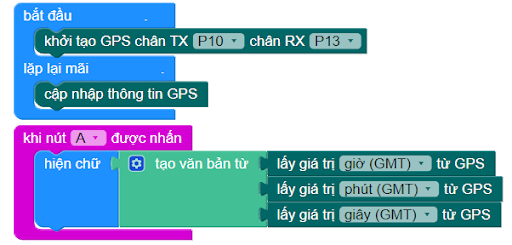 Chương trình đơn giản để kiểm tra thời gian lấy được từ GPS khi ấn nút A sẽ như sau: