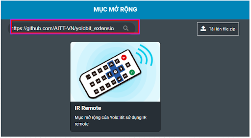 Bước 1: Tải thư viện IR Remote, bằng cách dán đường link sau vào phần tìm kiếm thư viện: https://github.com/AITT-VN/yolobit_extension_mqx.git