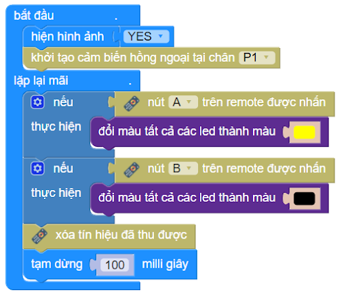 Nếu nút A trên remote được nhấn, tất cả các đèn LED sẽ chuyển sang màu vàng.