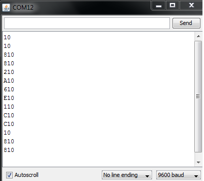 Giải thích chương trình: Sau khi upload đoạn code trên, các bạn mở cửa sổ Serial và bấm các nút của remote, tùy loại remote sẽ có giá trị trả về khác nhau, Đây là các giá trị HEX của tín hiệu được gửi từ remote, thử tất cả các nút của remote các bạn sẽ biết được IR codes của nó.