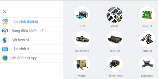 Bước 1: Chọn thiết bị lập trình mà bạn có: BatmanBot, TankBot, TransformBot, Robot Wall - E trên VovinamStem App: