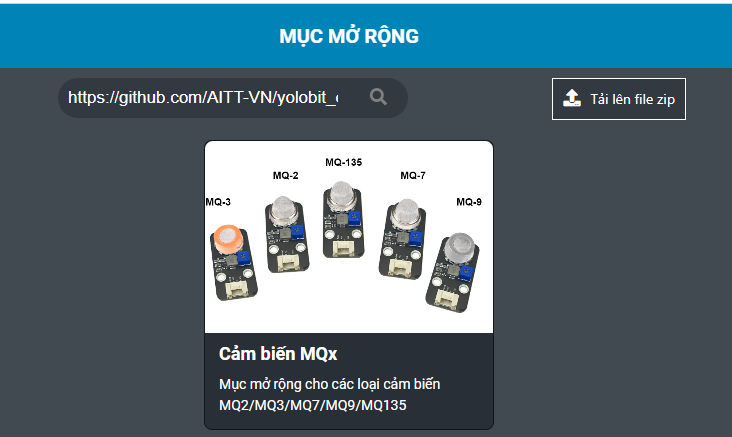 Bước 1: Tải thư viện Cảm biến MQx, bằng cách dán đường link sau vào phần tìm kiếm thư viện: https://github.com/AITT-VN/yolobit_extension_mqx.git