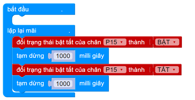 Sử dụng các khối lệnh trong danh mục CHÂN CẮM để làm việc với đèn module đóng ngắt 2 kênh.