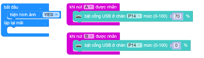 Chúng ta sẽ sử dụng nút A trên mạch Vovinam:Bit để bật đèn ở độ sáng 70%. Nút B để chuyển đèn về độ sáng 0% (tắt đèn).