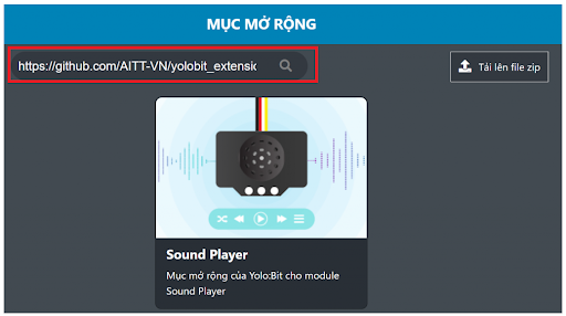 Bước 1: Tải thư viện Sound Player, bằng cách dán đường link sau https://github.com/AITT-VN/yolobit_extension_sound_player.git vào phần tìm kiếm thư viện.