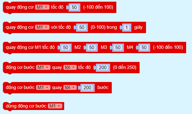 Với các lệnh cơ bản này, bạn có thể xây dựng 1 mô hình robot 4 bánh xe hoặc các mô hình khác theo ý thích. Module hỗ trợ cả 2 loại động cơ bước và động cơ 1 chiều (DC), tuy nhiên khi sử dụng, chúng ta chỉ được phép sử dụng 1 trong 2 loại cùng lúc.