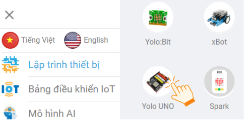 Bước 1: Truy cập vào https://app.vovinam-map.org/ , chọn thiết bị lập trình Yolo UNO.