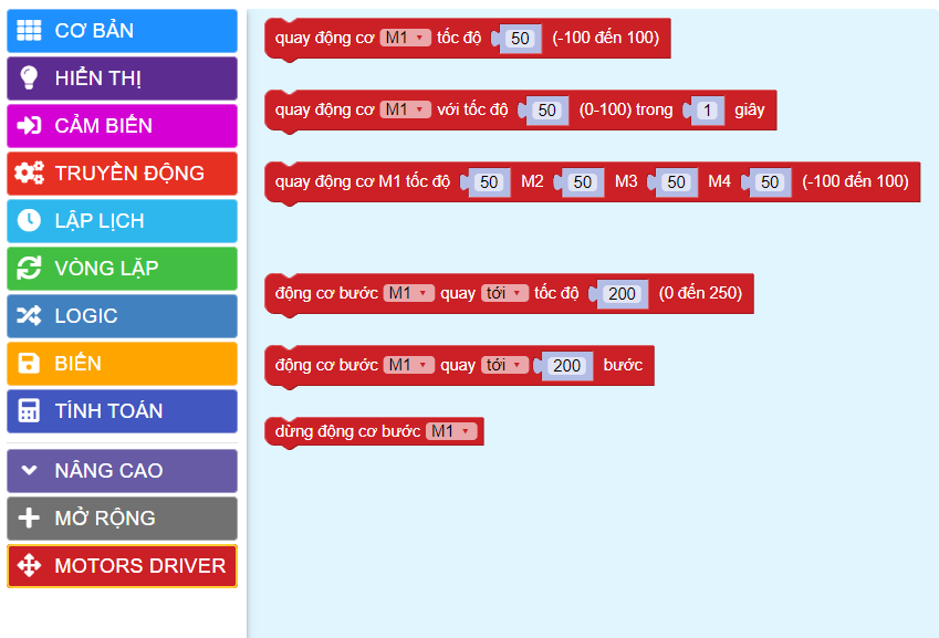Sau khi tải thành công thư viện, trong danh mục khối lệnh sẽ xuất hiện các khối lệnh như sau: