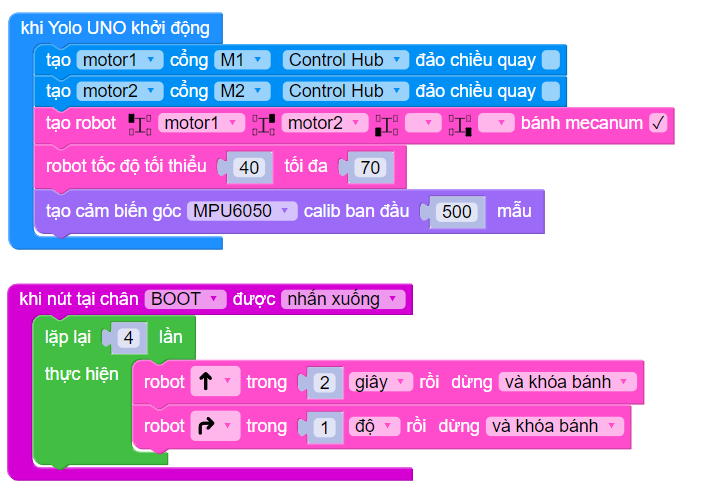 Chương trình sau khởi tạo robot 2 bánh có sử dụng cảm biến góc và di chuyển một hình vuông khi nút BOOT trên ORC Control Hub được nhấn.