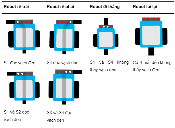 Để robot có thể dò đường theo đúng đường line đen trên sa bàn, chúng ta cần tìm hiểu các tình huống có thể xảy ra như sau: