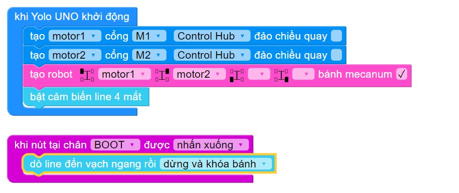 Chương trình dưới đây sẽ điều khiển robot di chuyển theo đường line đen cho đến vạch đen kế tiếp mỗi khi nhấn nút BOOT có trên ORC Control Hub.