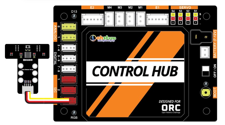 Cảm biến dò line sử dụng giao tiếp I2C nên cần cắm vào cổng màu đỏ bất kỳ trên ORC Control Hub.