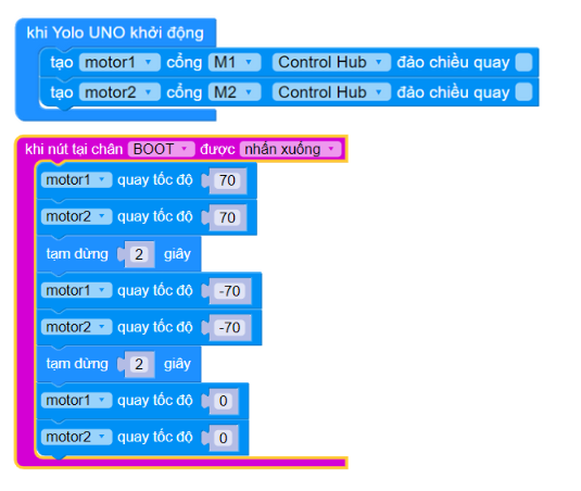 Chương trình sau sẽ quay 2 động cơ tới 2 giây và quay ngược 2 giây rồi dừng lại mỗi khi nhấn nút Boot trên mạch ORC Control Hub.