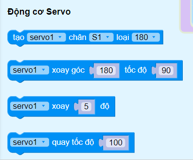 Các khối lệnh làm việc với động cơ servo cũng nằm trong danh mục khối lệnh Động cơ.