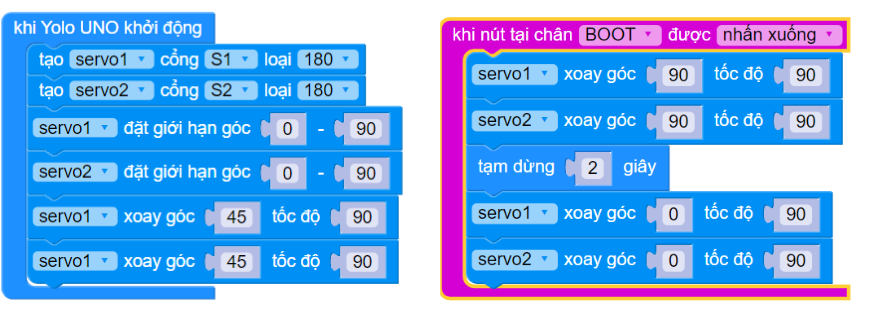 Chương trình sau khai báo 2 động cơ servo, và quay góc để tay gắp nâng lên hạ xuống, đóng và mở sau 2 giây.