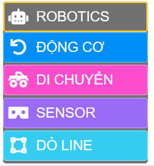 Trong tài liệu này, chúng ta sẽ dùng các khối lệnh trong các danh mục trên để lập trình các tính năng của Robot.