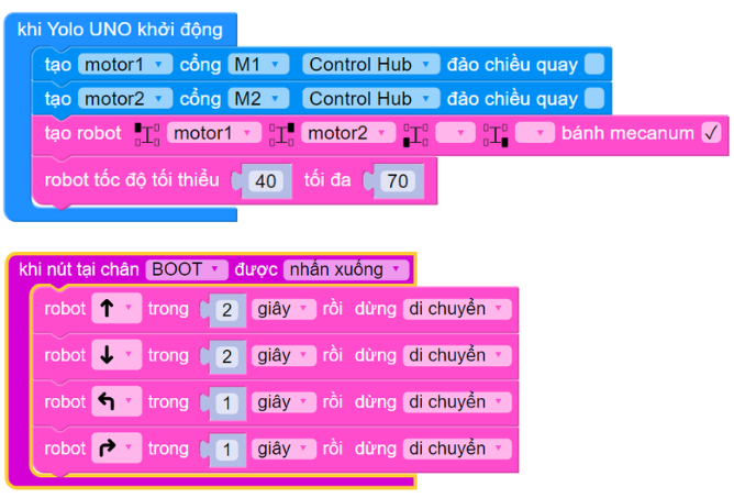 Chương trình sau khai báo một cấu hình robot có 2 động cơ, động cơ bên trái gắn vào cổng M4, và động cơ bên phải gắn vào cổng M1. Chương trình cho robot đi tới/lùi/quay trái/quay phải sau mỗi 2 giây khi nhấn nút BOOT trên mạch Yolo UNO.
