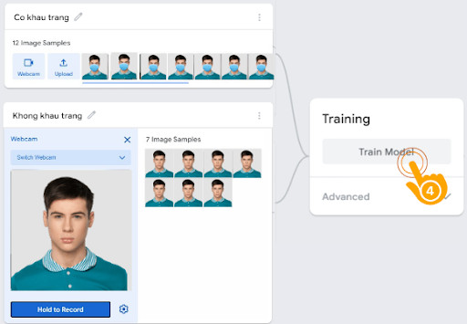 Chọn vào Webcam và nhấn Hold to Record để thu thập mẫu. Sau khi hoàn tất, chọn Train Model