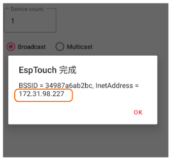 Sau khi đã gửi tín hiệu cấu hình đi, bạn vui lòng chờ trong giây lát, sẽ có 1 thông báo hiện ra như hình và ghi chú lại địa chỉ IP: (Nếu thay đổi mạng wifi, bạn cần thực hiện các thao tác trên)