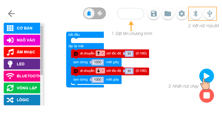 Chương trình đơn giản: Đây là chương trình điều khiển Rover đi tới và lùi, giúp bạn làm quen với lập trình điều khiển Rover di chuyển
