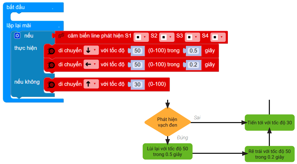 Nếu 4 mắt đọc được vạch đen, lùi lại và rẽ trái để tránh