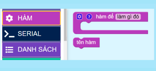 Khối lệnh mới với tên vừa đặt sẽ xuất hiện trong mục Hàm.