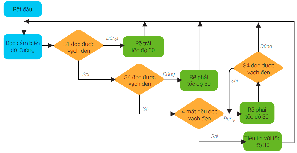 Rover sẽ quay lại cho đến khi gặp được vạch thẳng di chuyển (S4 đọc được vạch đen)