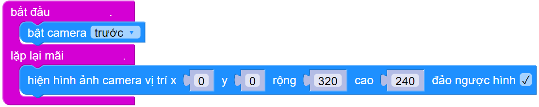 Hiện tại, với phiên bản chạy trên máy tính, bạn đọc cần khởi động Camera trước. Với câu lệnh trong phần lặp mãi mãi, bạn hãy đảm bảo rằng mình đã chọn vào đảo ngược hình (do chúng ta đang sử dụng Camera trước của laptop). |