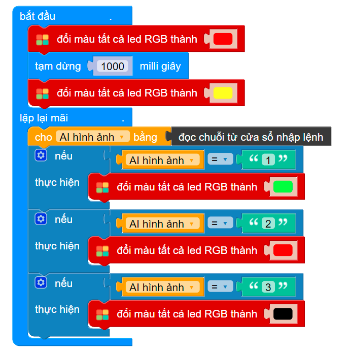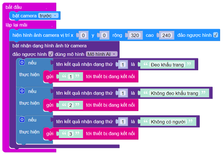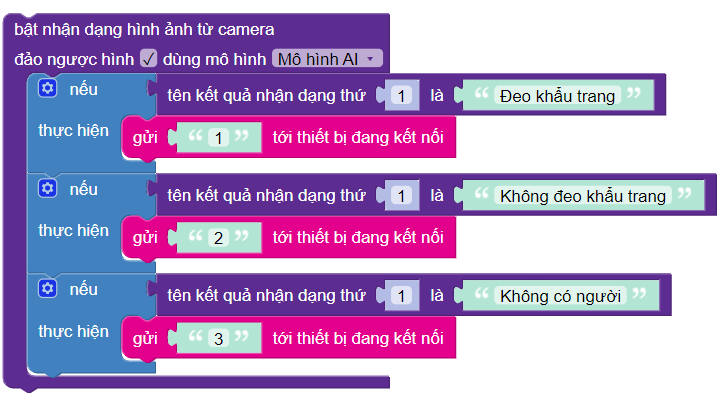Chúng ta phân loại kết quả nhận dạng từ AI bằng các câu lệnh nếu, và gửi kết quả này xuống mạch Vovinam:Bit cho những bước xử lý tiếp theo, như gợi ý ở phần bên dưới: