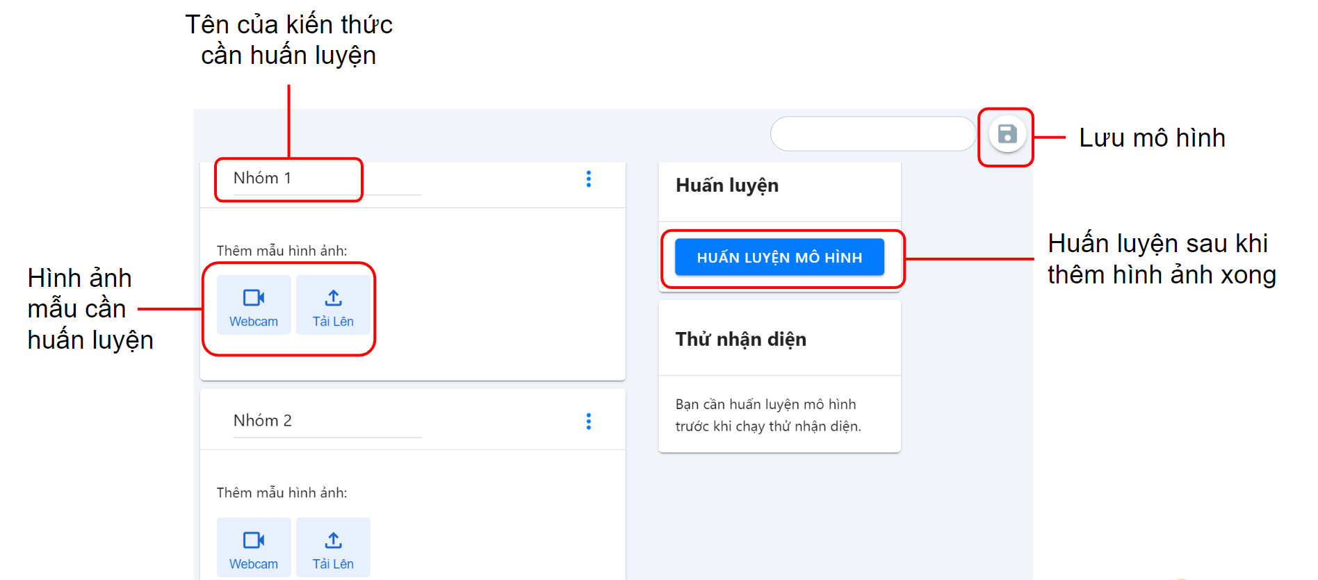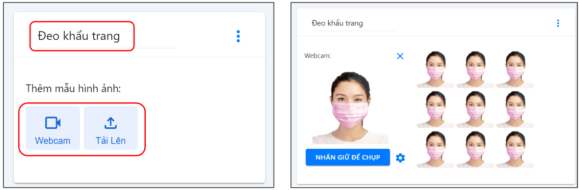 Bước 2: Với giao diện mới được hiện ra, bạn đặt tên cho kiến thức mà mình muốn huấn luyện, chẳng hạn như là Đeo Khẩu Trang, và nhấn tiếp vào nút WEBCAM/ Tải lên ở ngay bên dưới để lấy mẫu.