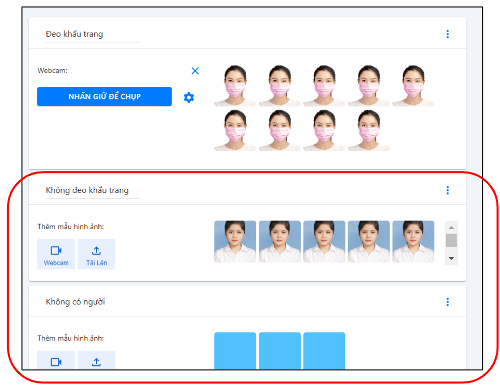 Bước 3: Thực hiện tương tự cho kiến thức Không đeo khẩu trang và Không có người.