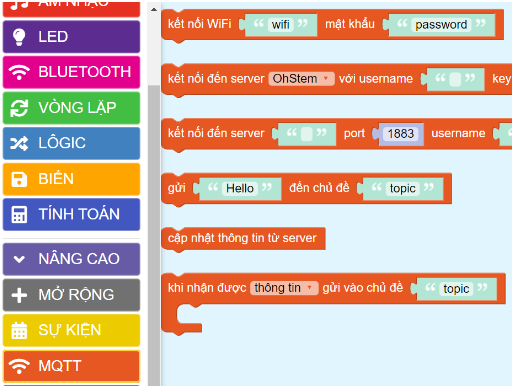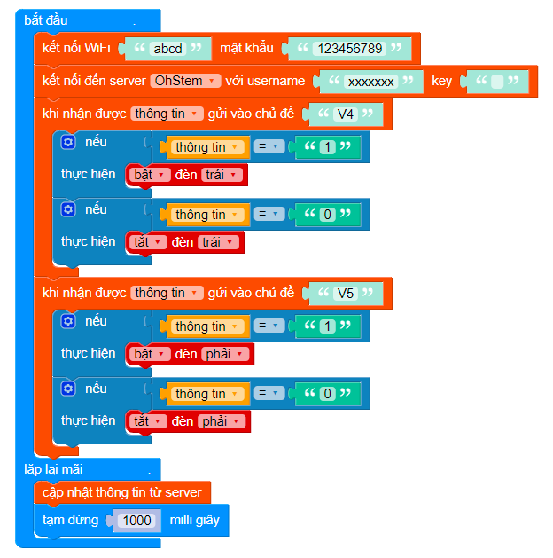 Sau khi kết nối với mạng WiFi, chúng ta sẽ lập trình để Vovinam:Bit kết nối với server VovinamStem mà chúng ta đã tạo trước đó, thông qua 2 thông tin là Username và key sẽ bỏ trống.