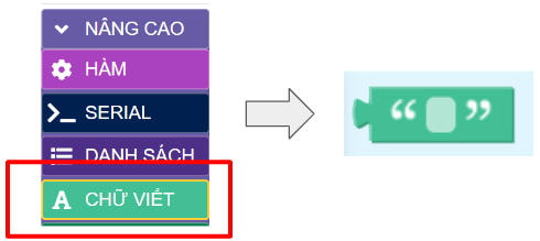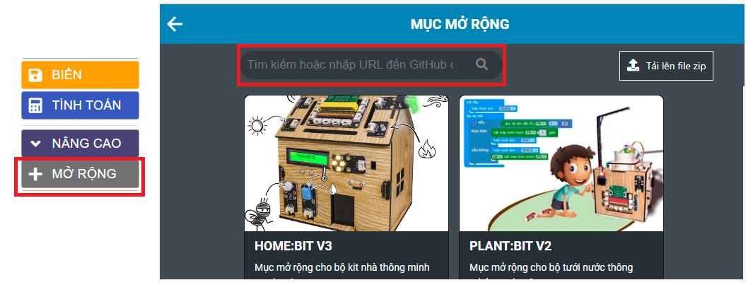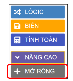 Trong danh mục khối lệnh, chọn vào khối MỞ RỘNG để mở các thư viện mở rộng, như minh họa ở hình dưới: