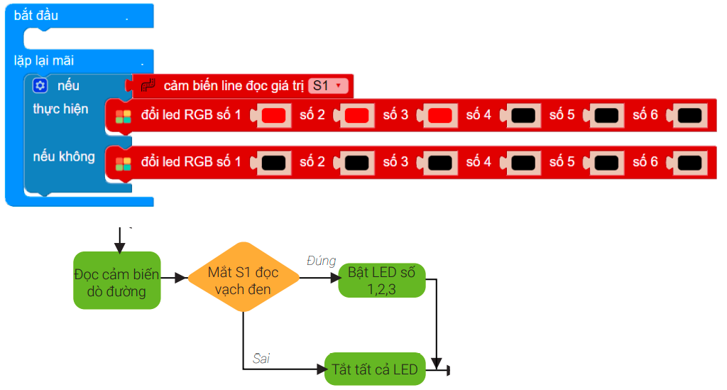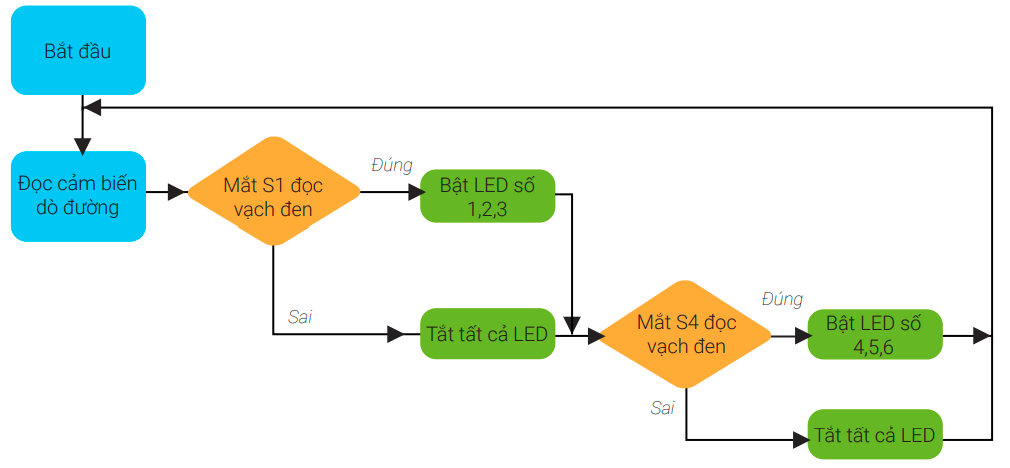 Tạo điều kiện đầu tiên: Nếu mắt S1 đọc được vạch đen, bật đèn số 1, 2, 3. Nếu không, tắt đèn